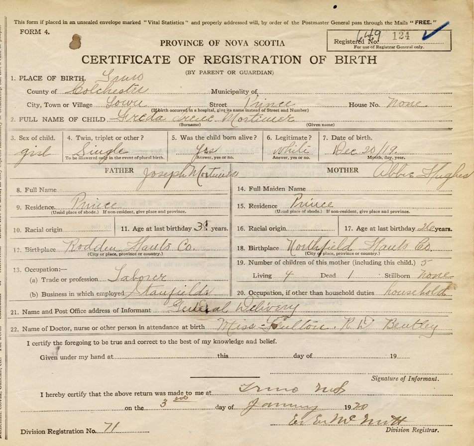 21. Name and Post Office address of Informant General Delivery, Truro, Colchester Co., NS