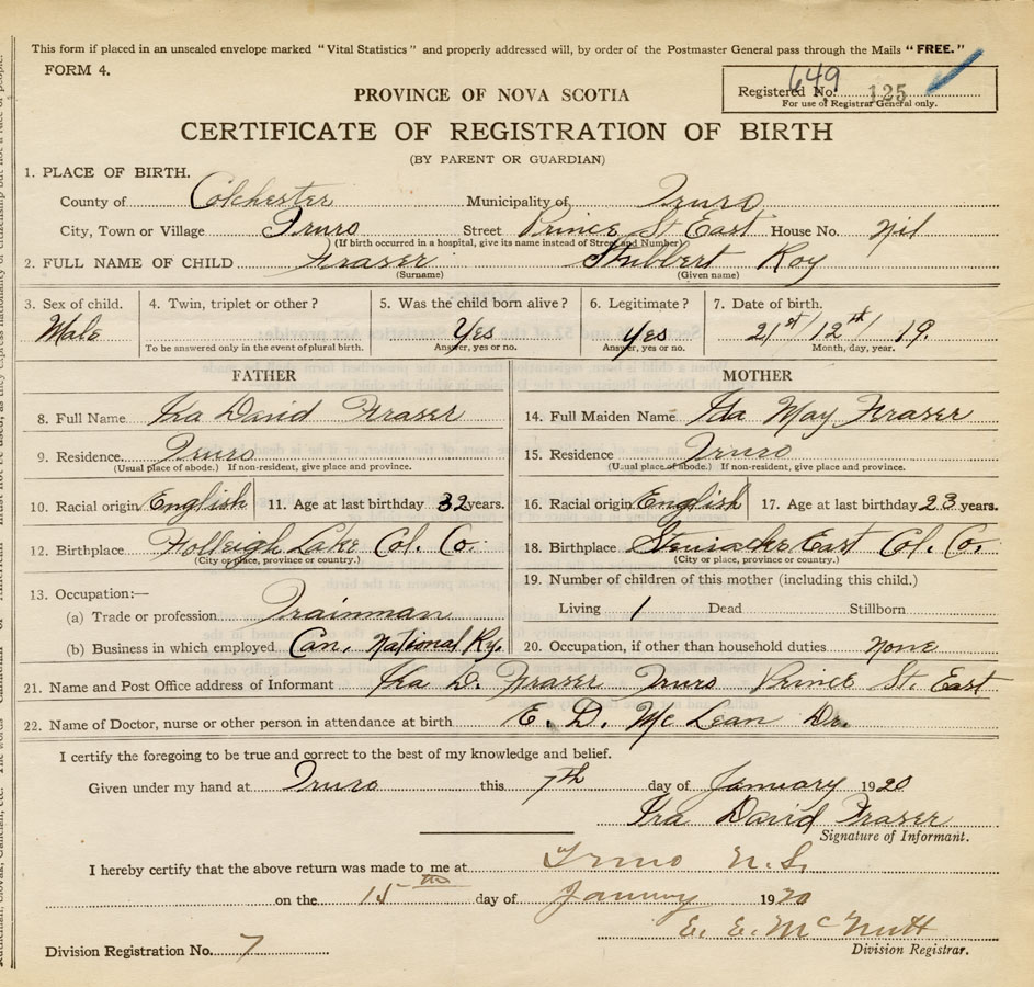 21. Name and Post Office address of Informant Ira D. Fraser Truro, Colchester Co., NS