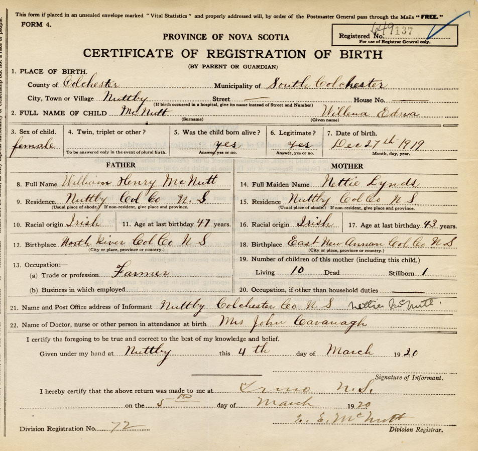 21. Name and Post Office address of Informant Nettie McNutt Nuttby, Colchester Co., N.S.