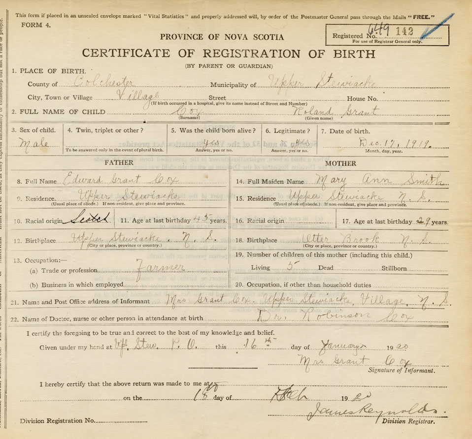 21. Name and Post Office address of Informant Mrs. Grant Cox Upper Stewiacke Village, N.S.
