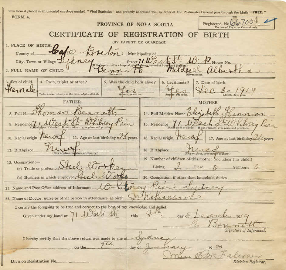 born at Sydney Cape Breton County on December 3, 1919