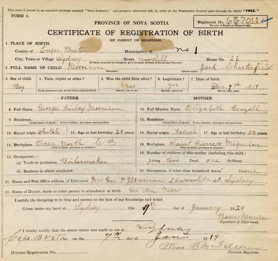 Born at Sydney in the County of Cape Breton