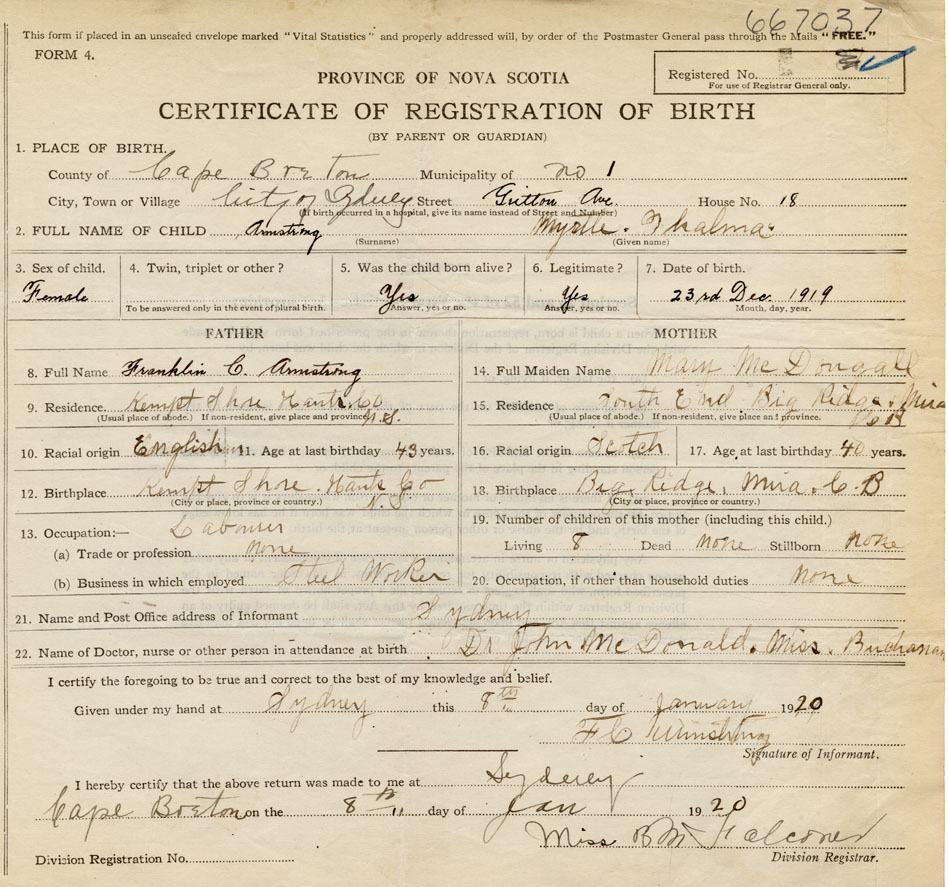Date of Birth December 23, 1919 Place of Birth SydneyCounty of Cape Breton