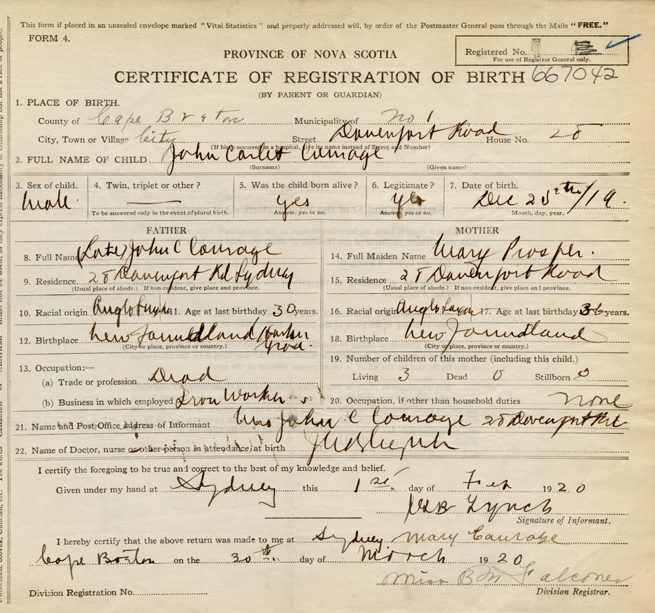 Date of Birth December 25, 1919 Place of Birth SydneyCounty of Cape Breton