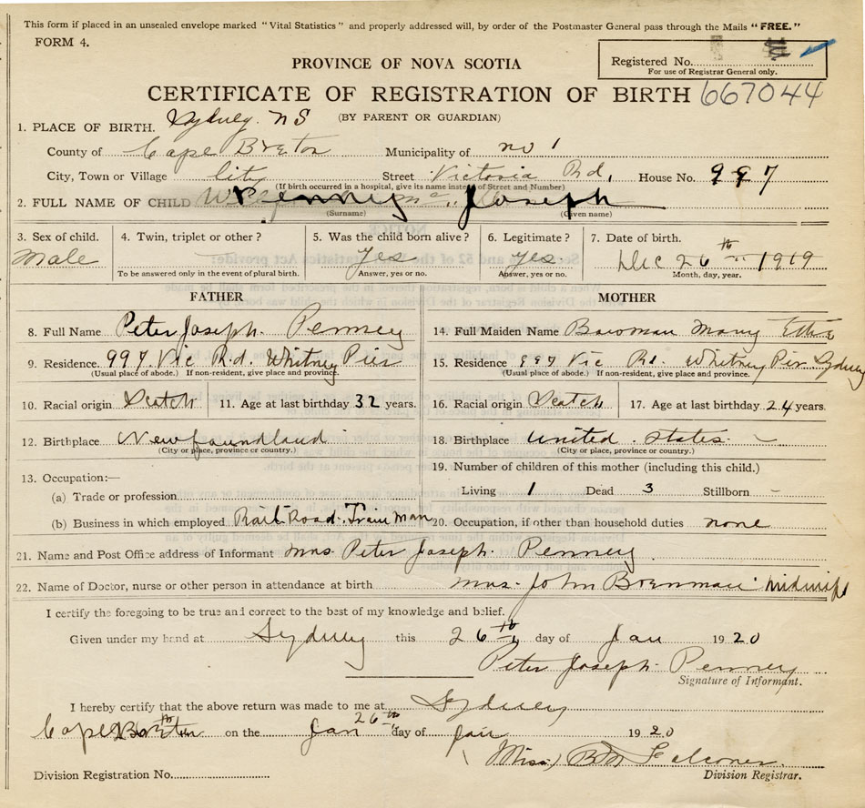 Date of Birth December 26, 1919 Place of Birth SydneyCounty of Cape Breton