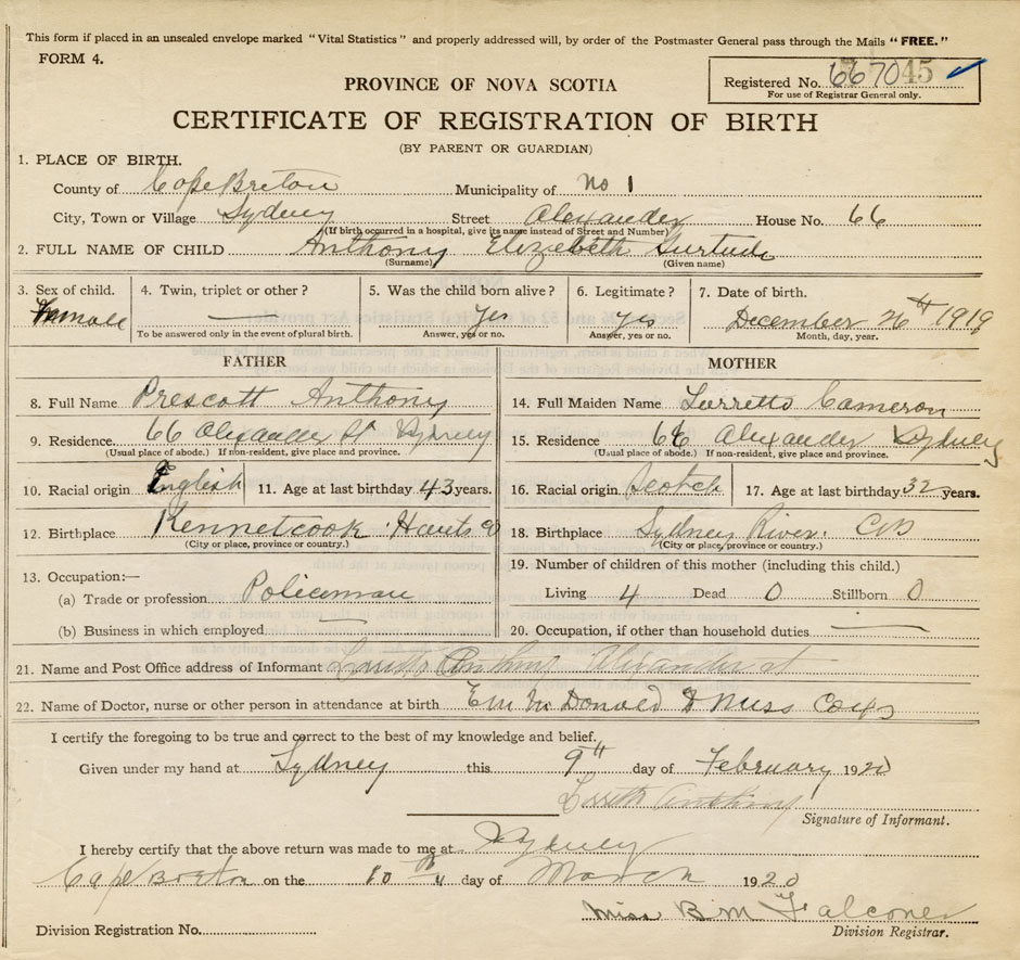 Date of Birth December 26, 1919 Place of Birth SydneyCounty of Cape Breton