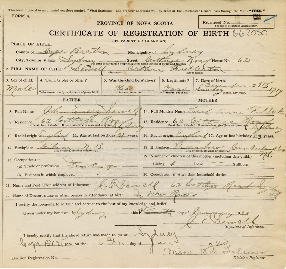 Date of Birth December 28, 1919 Place of Birth SydneyCounty of Cape Breton