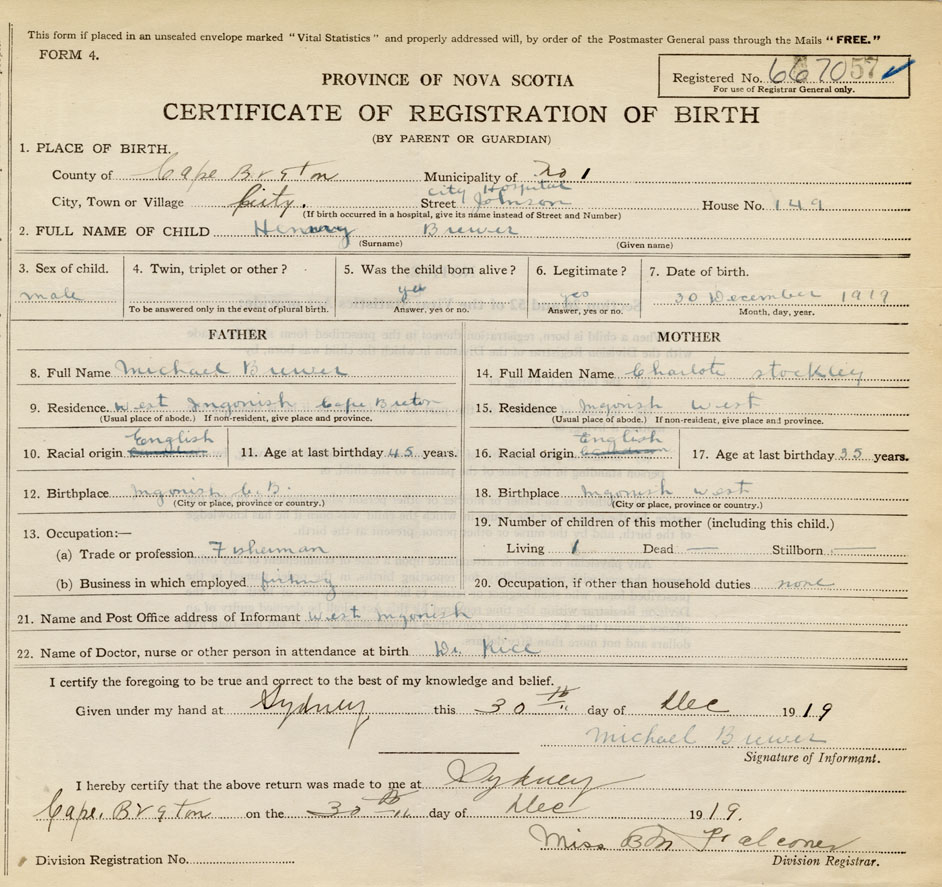 Date of Birth December 30, 1919 Place of Birth SydneyCounty of Cape Breton