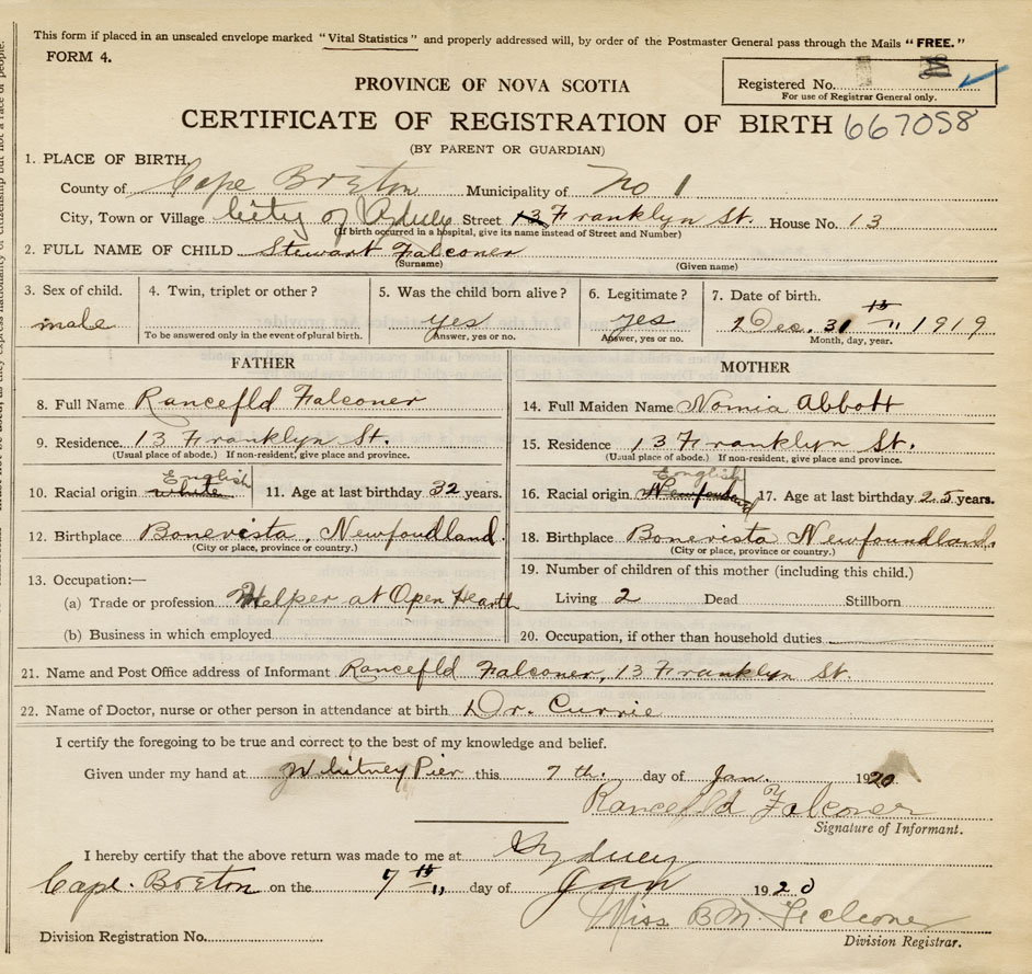 Date of Birth December 31, 1919 Place of Birth SydneyCounty of Cape Breton