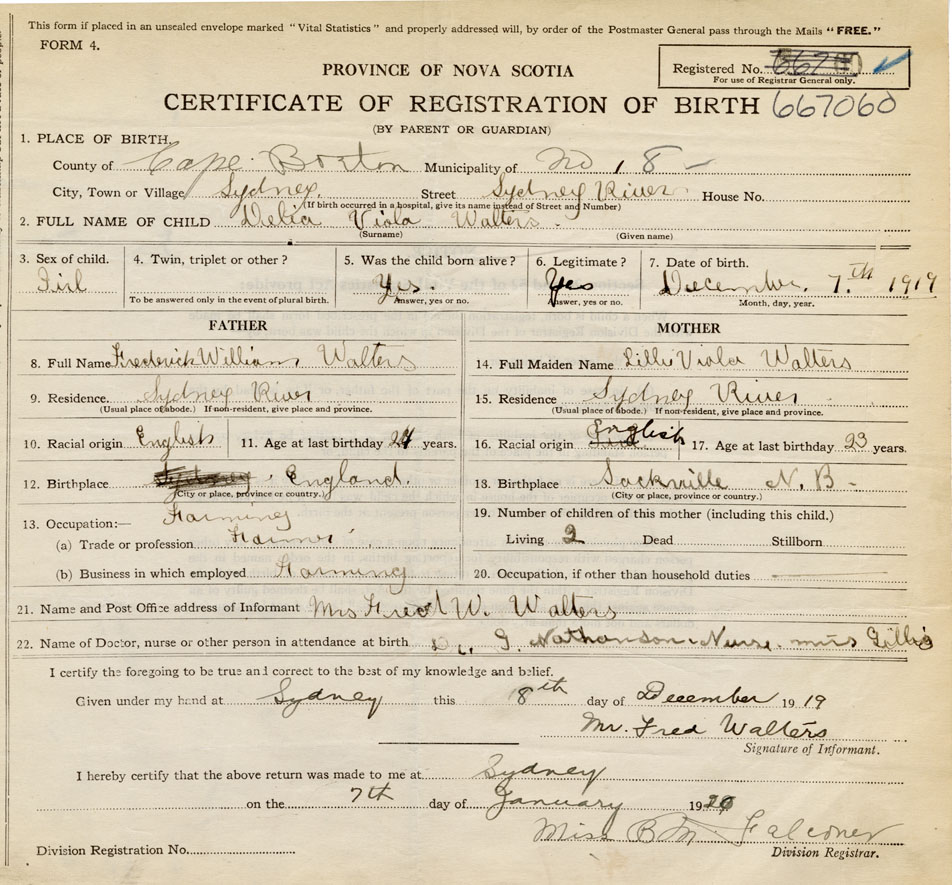born at Sydney River Cape Breton County on December 7, 1919