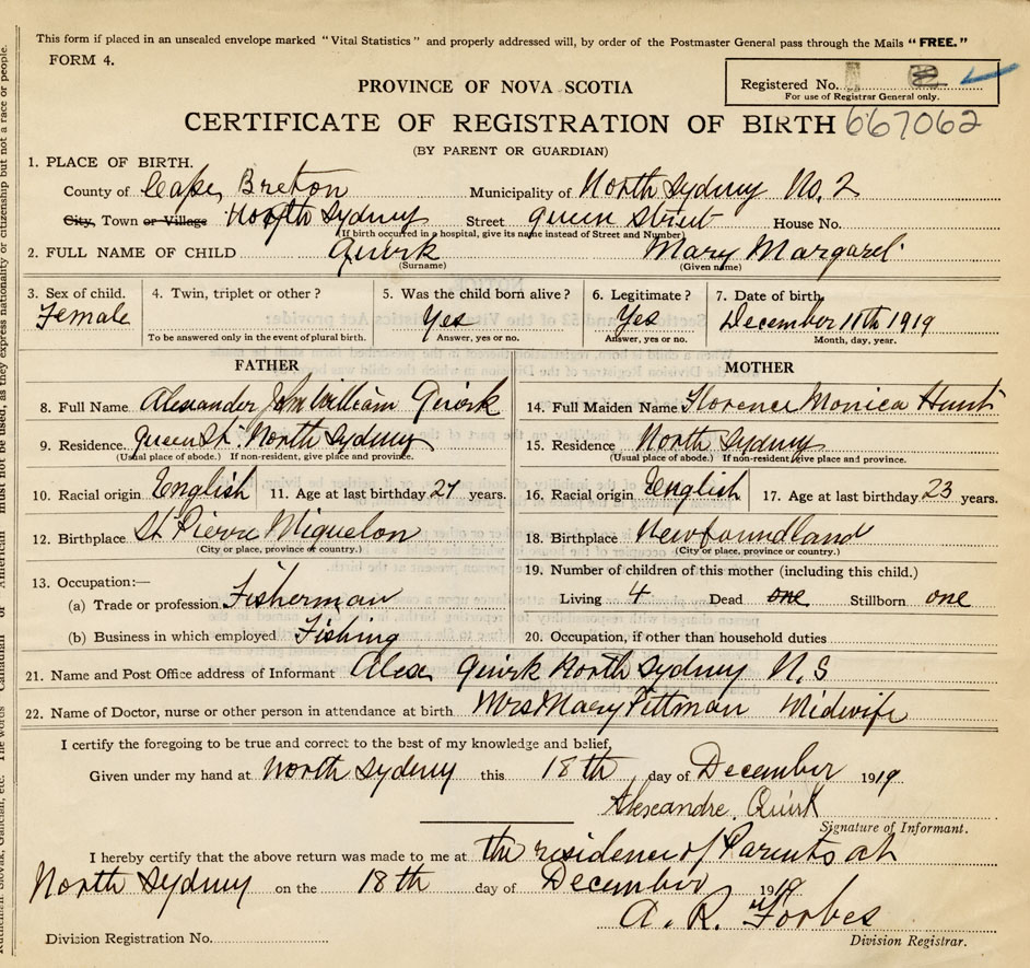 Date of Birth December 11, 1919 Place of Birth North SydneyCounty of Cape Breton