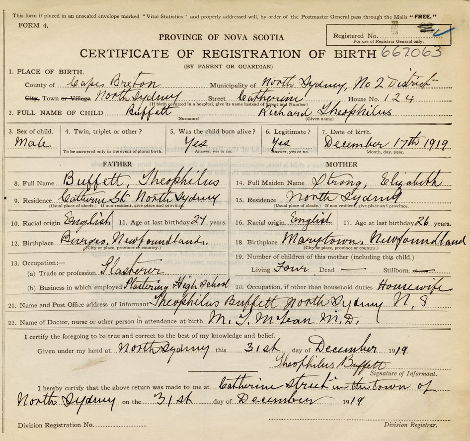 I hereby make application for the Registration of Birth of Richard TheophilusBuffett Sex Male
