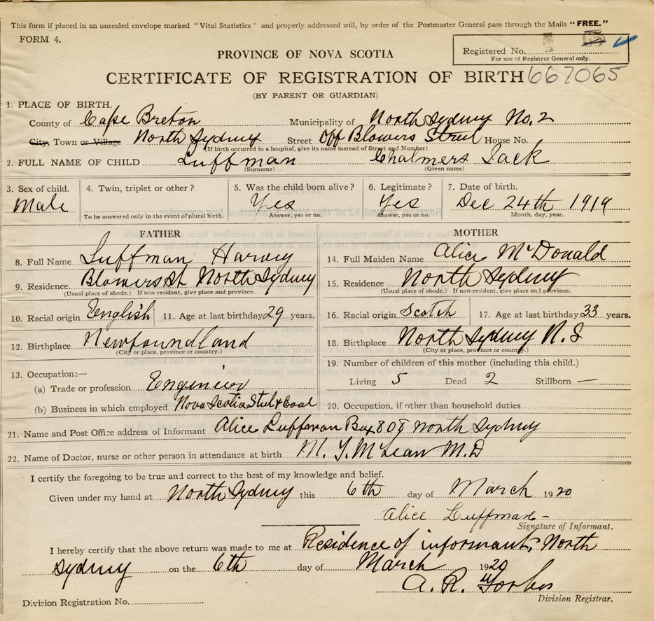 Date of Birth December 24, 1919 Place of Birth North SydneyCounty of Cape Breton