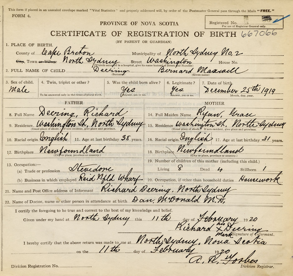 Date of Birth December 25, 1919 Place of Birth North SydneyCounty of Cape Breton