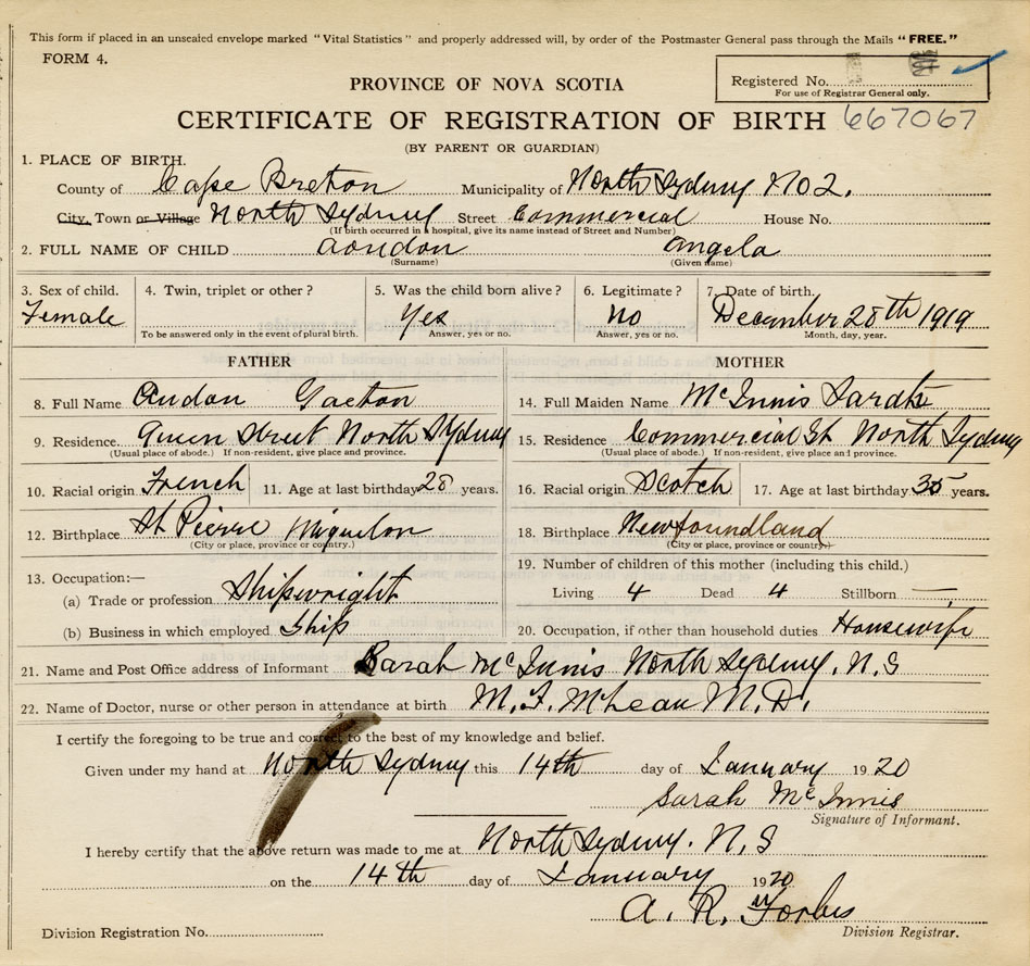 Date of Birth December 28, 1919 Place of Birth North SydneyCounty of Cape Breton