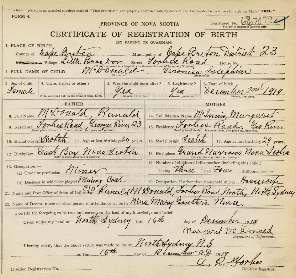 Date of Birth December 2, 1919 Place of Birth Little Bras D'OrCounty of Cape Breton