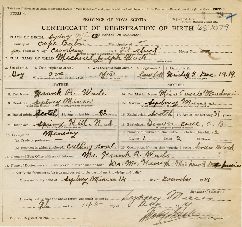 born at Sydney Mines Cape Breton County on December 5, 1919