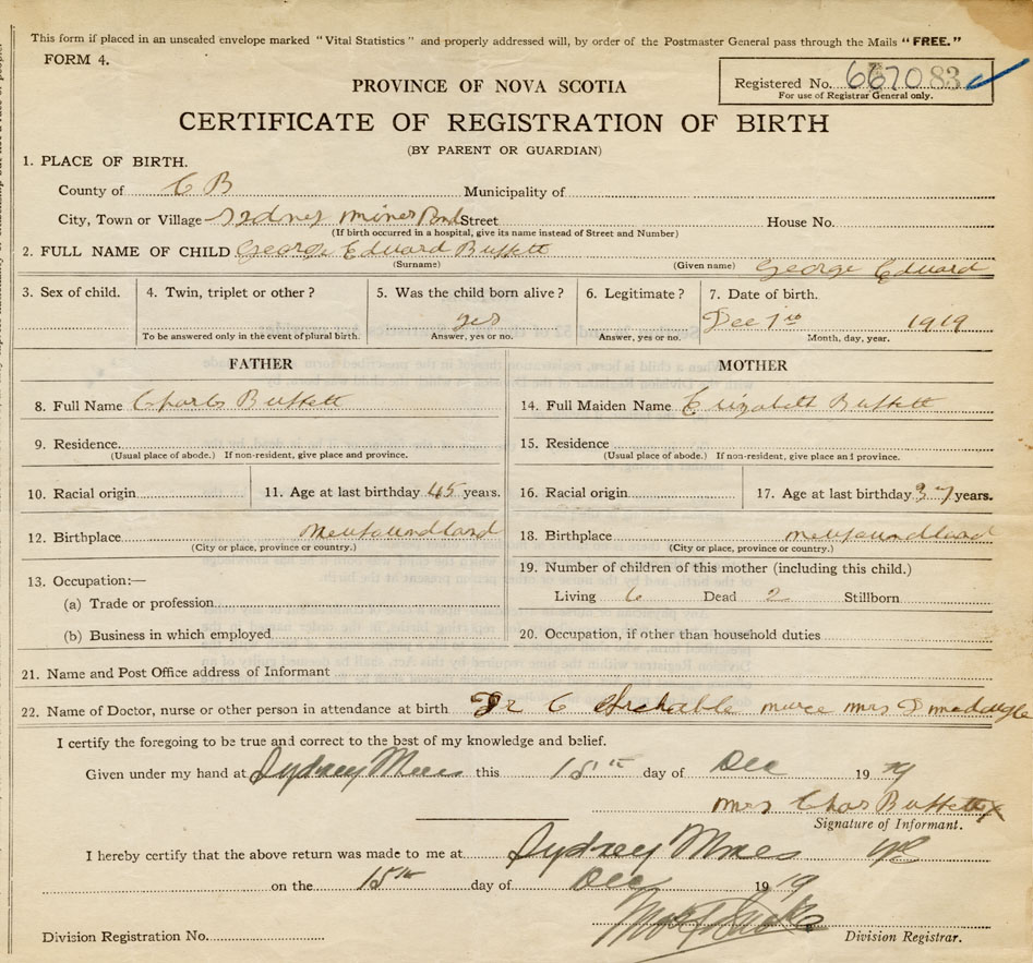 born at Sydney Mines Cape Breton County on December 7, 1919