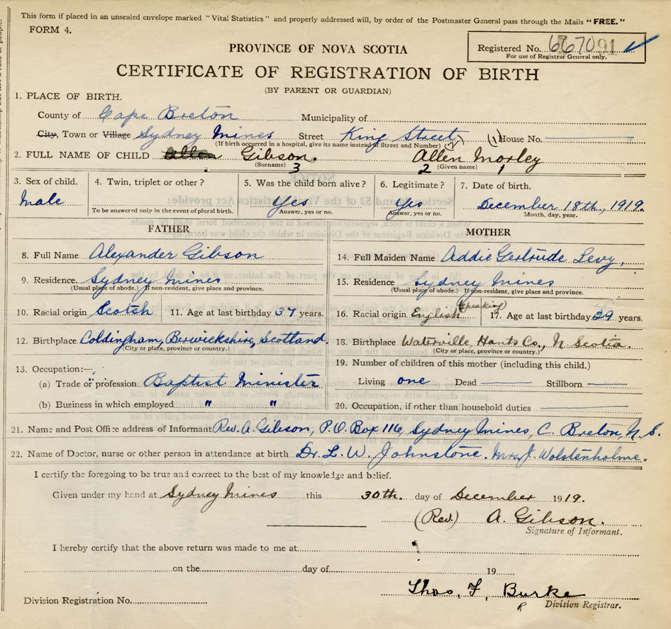 Born at Sydney Mines in the County of Cape Breton