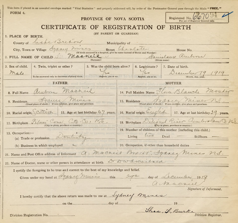 born at Sydney Mines Cape Breton County on December 19, 1919