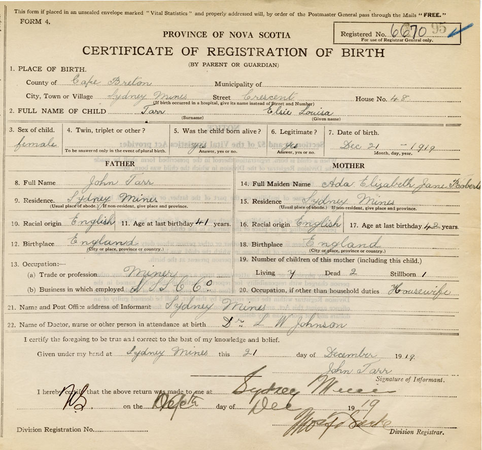 born at Sydney Mines Cape Breton County on December 21, 1919
