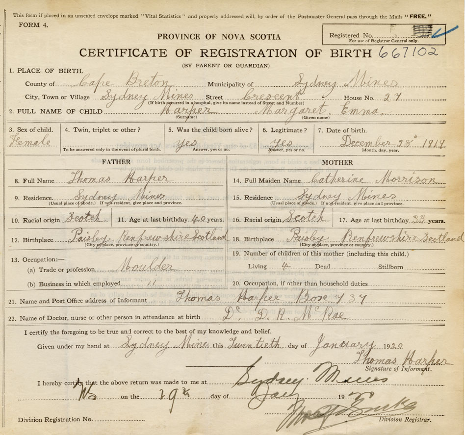 Born at Sydney Mines in the County of Cape Breton