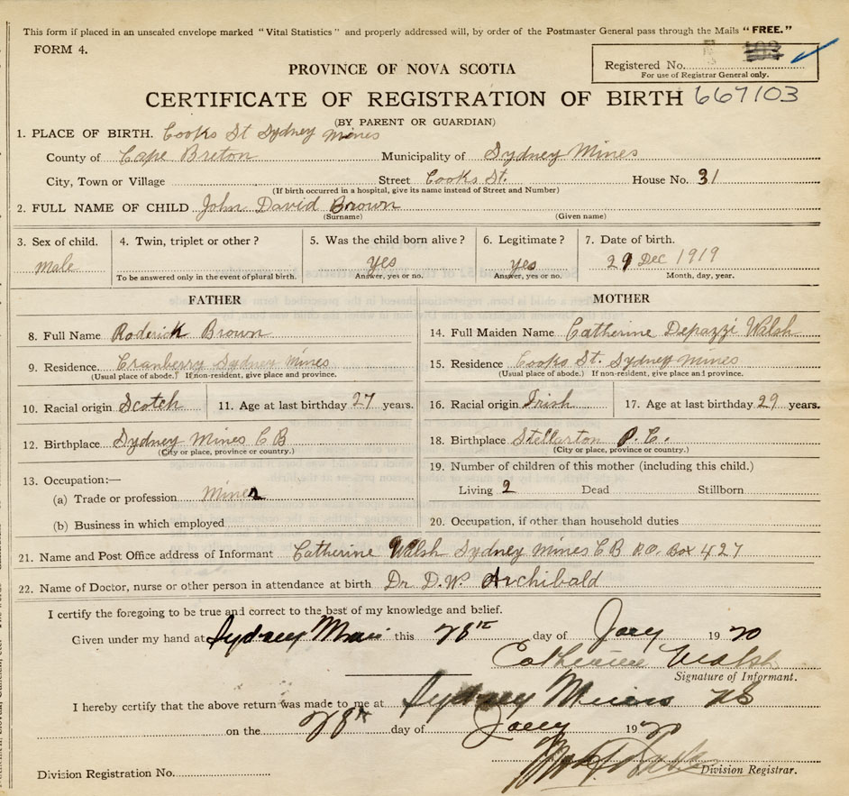 born at Sydney Mines Cape Breton County on December 29, 1919