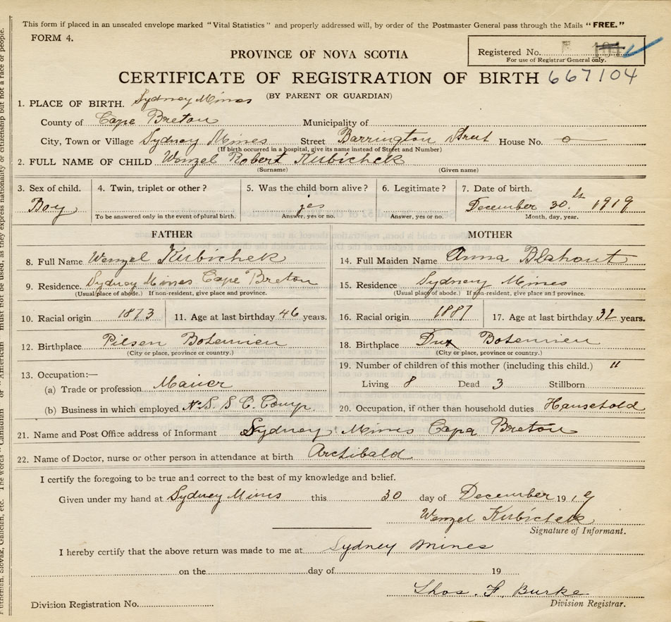 Date of Birth December 30, 1919 Place of Birth Sydney MinesCounty of Cape Breton