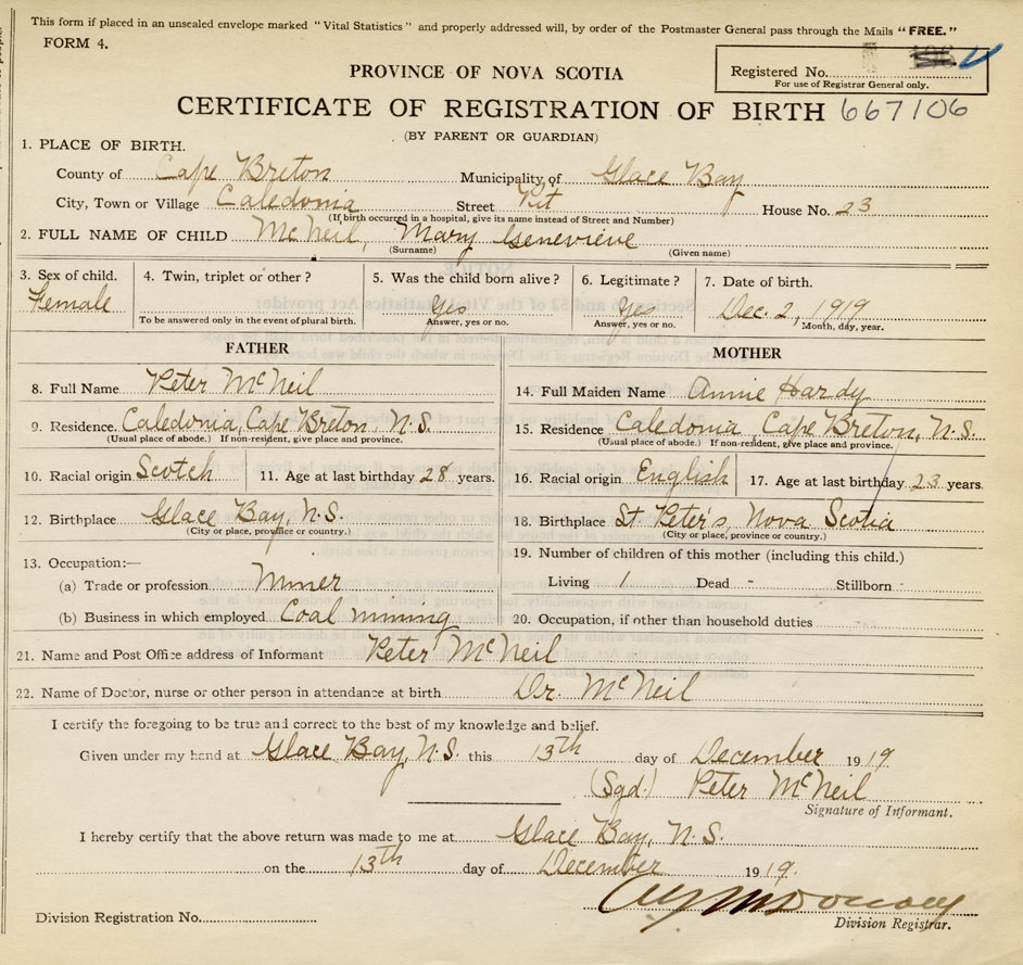 Occupation of Father at Birth of child Miner Place of birth of Father Glace Bay