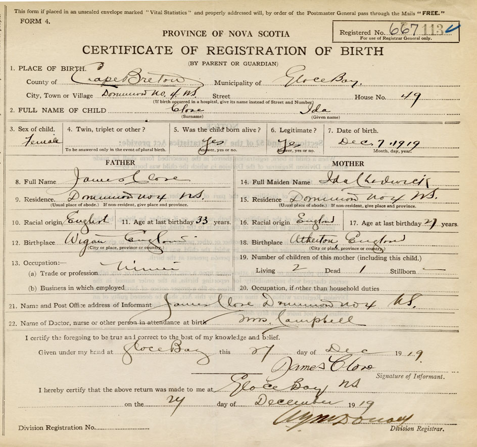 Name of Father James Close MAIDEN NAME of Mother Ida Chadwick