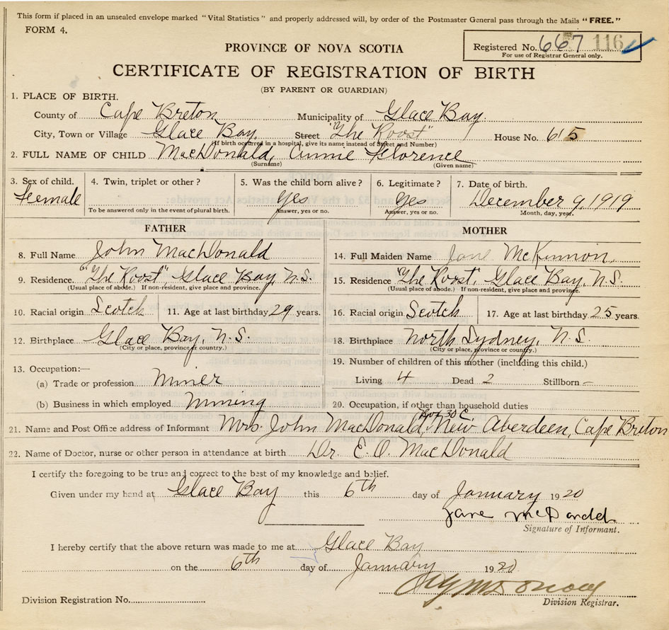 Occupation of Father at Birth of child Miner Place of birth of Father Glace Bay