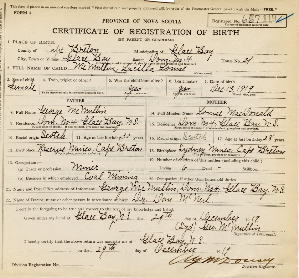Date of Birth December 13, 1919 Place of Birth Glace BayCounty of Cape Breton