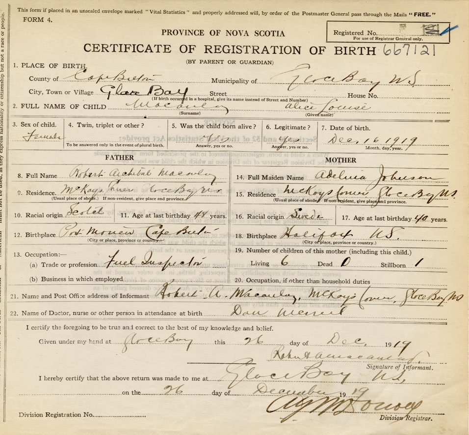 Residence of Father when child was born Glace Bay Present address of Father McKays Corner