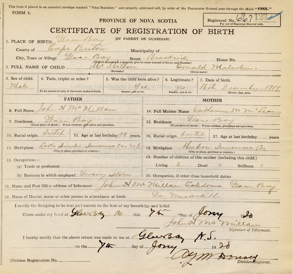 Date of Birth December 16, 1919 Place of Birth Glace BayCounty of Cape Breton