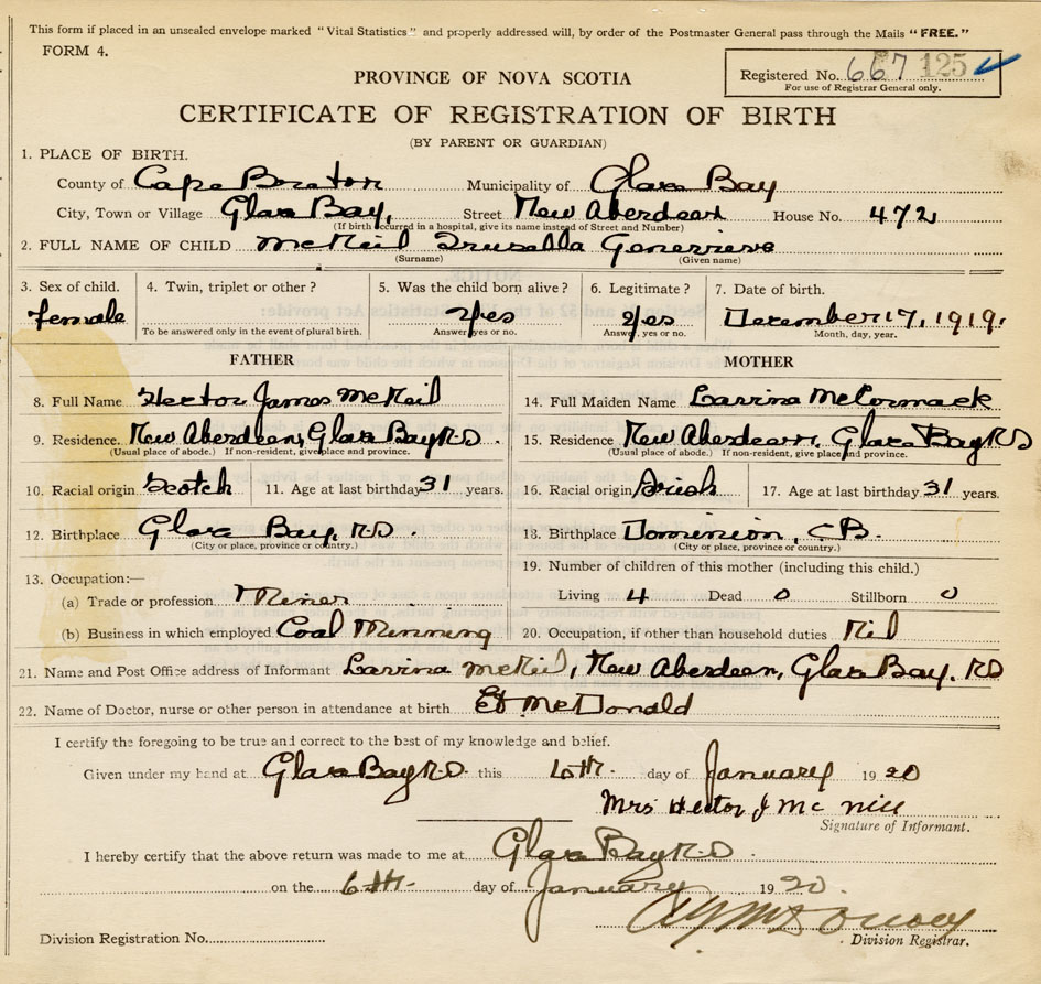 Name of Father Hector James McNeil MAIDEN NAME of Mother Larrina McCormack