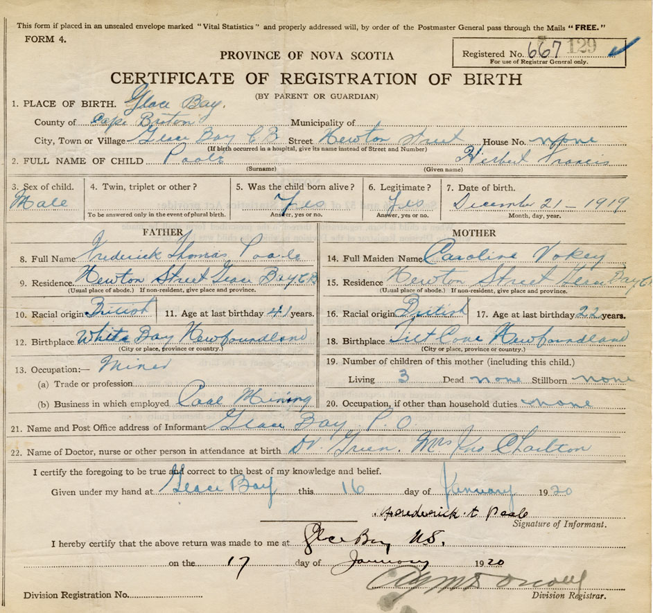 born at Glace Bay Cape Breton County on December 21, 1919