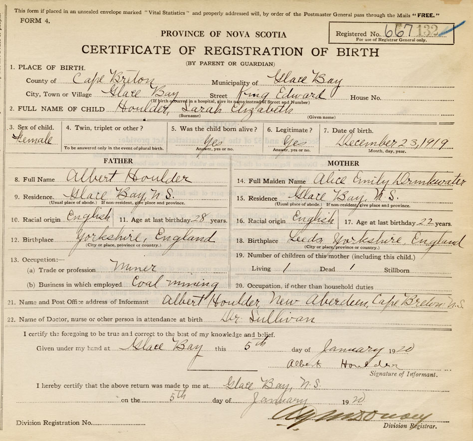 Born at Glace Bay in the County of Cape Breton