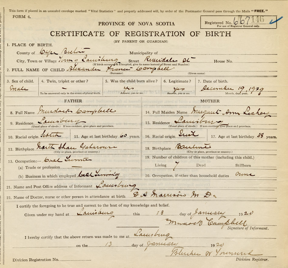 Date of Birth December 19, 1919 Place of Birth LouisburgCounty of Cape Breton