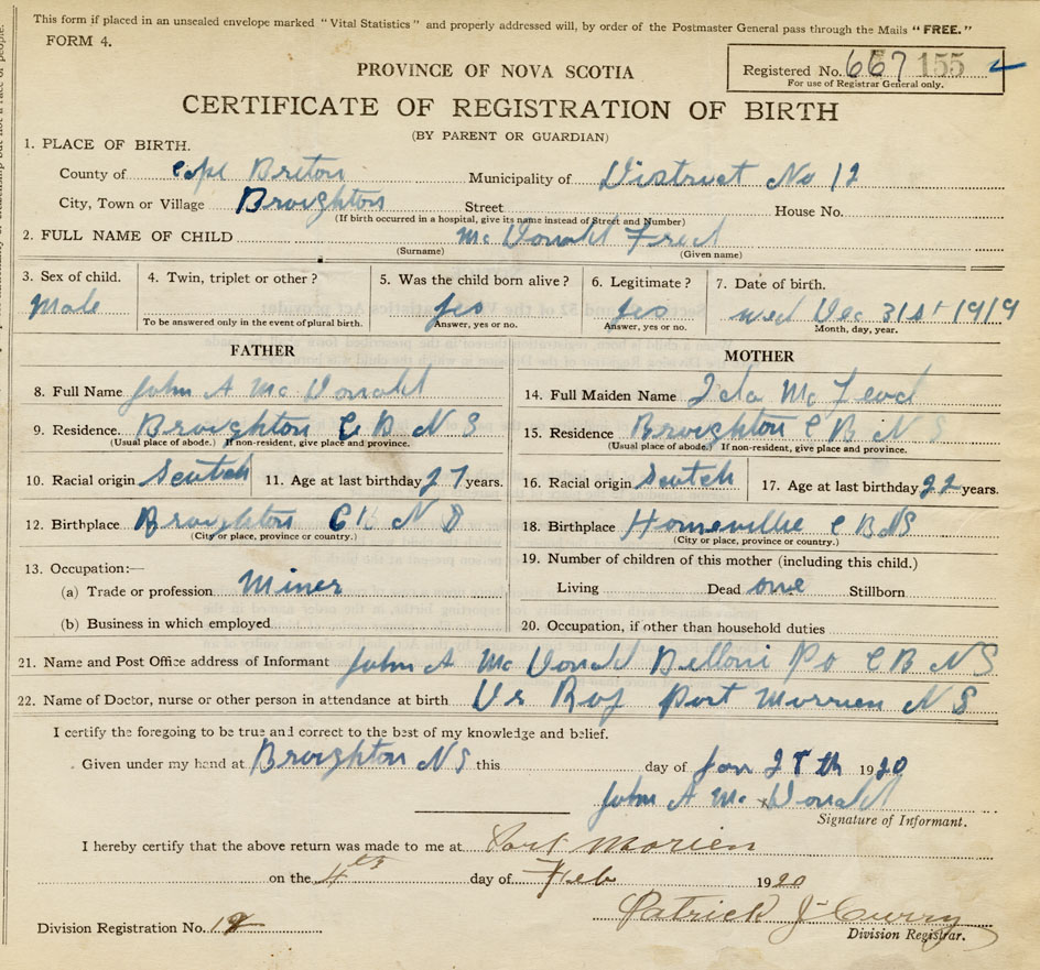 Date of Birth December 31, 1919 Place of Birth BroughtonCounty of Cape Breton