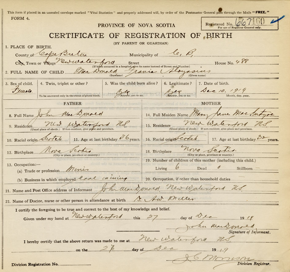 Date of Birth December 10, 1919 Place of Birth New WaterfordCounty of Cape Breton