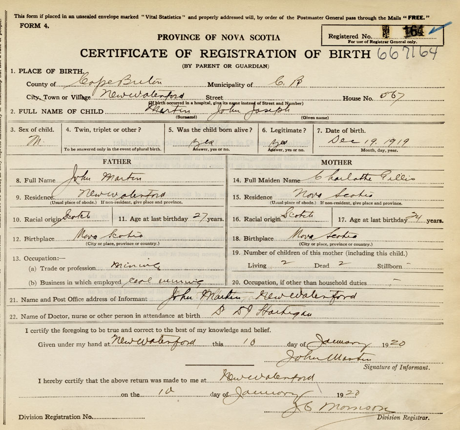 Date of Birth December 19, 1919 Place of Birth New WaterfordCounty of Cape Breton