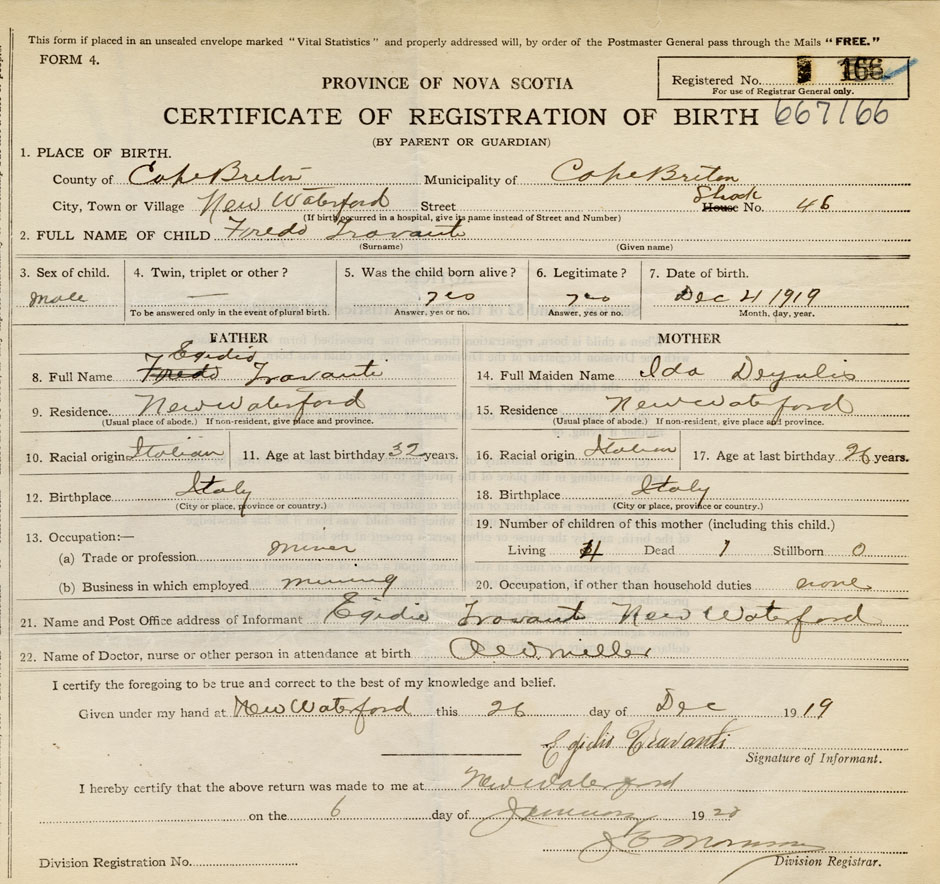 Signature of Applicant Egidis Trovanti Address of Applicant New Waterford Date 26 December 1919