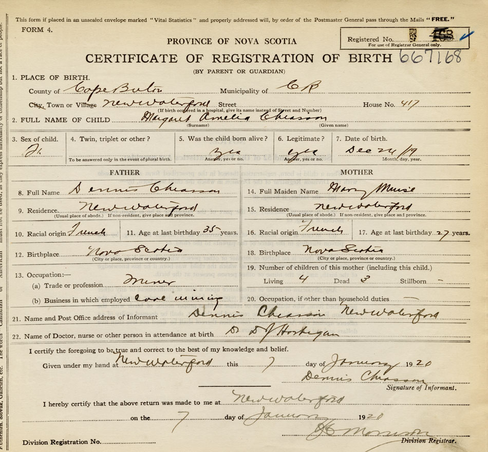 Date of Birth December 24, 1919 Place of Birth New WaterfordCounty of Cape Breton