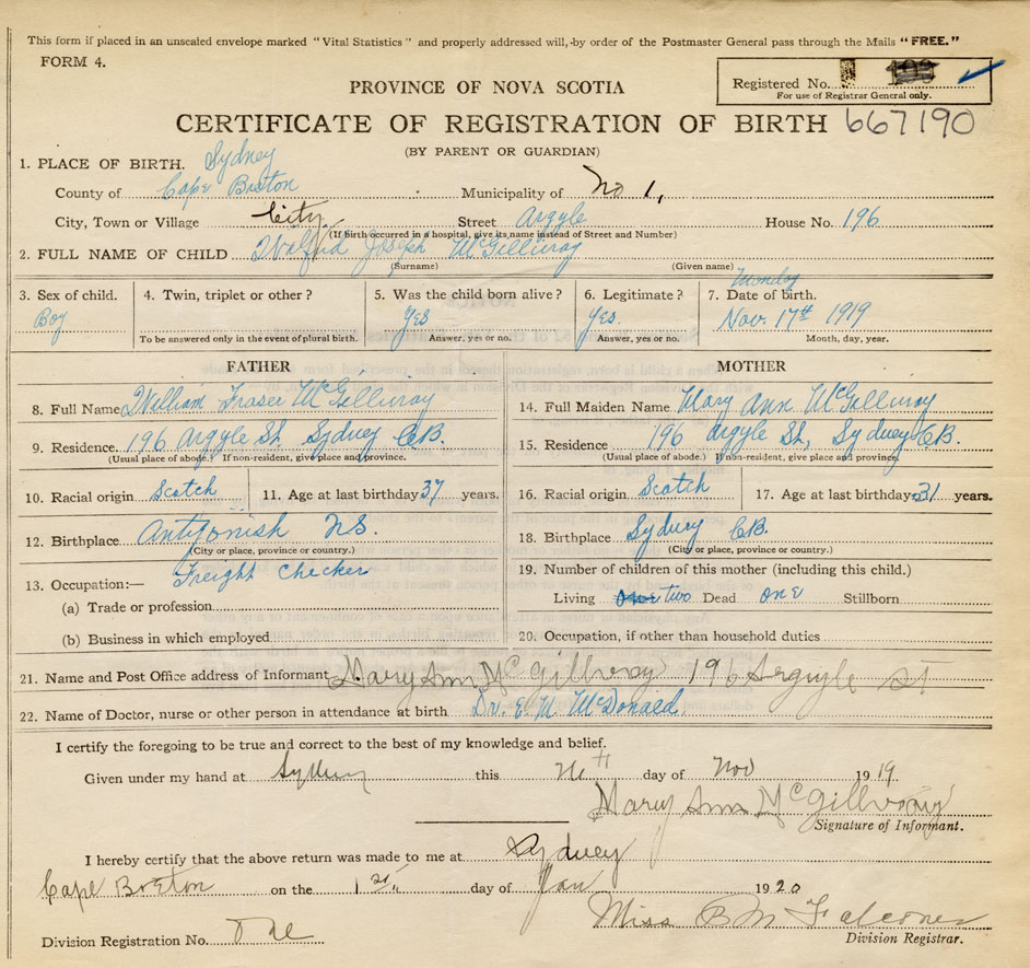 born at Sydney Cape Breton County on November 17, 1919