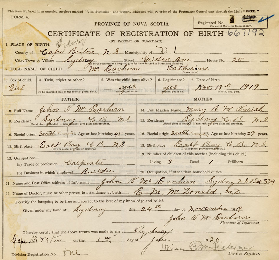 Date of Birth November 18, 1919 Place of Birth SydneyCounty of Cape Breton