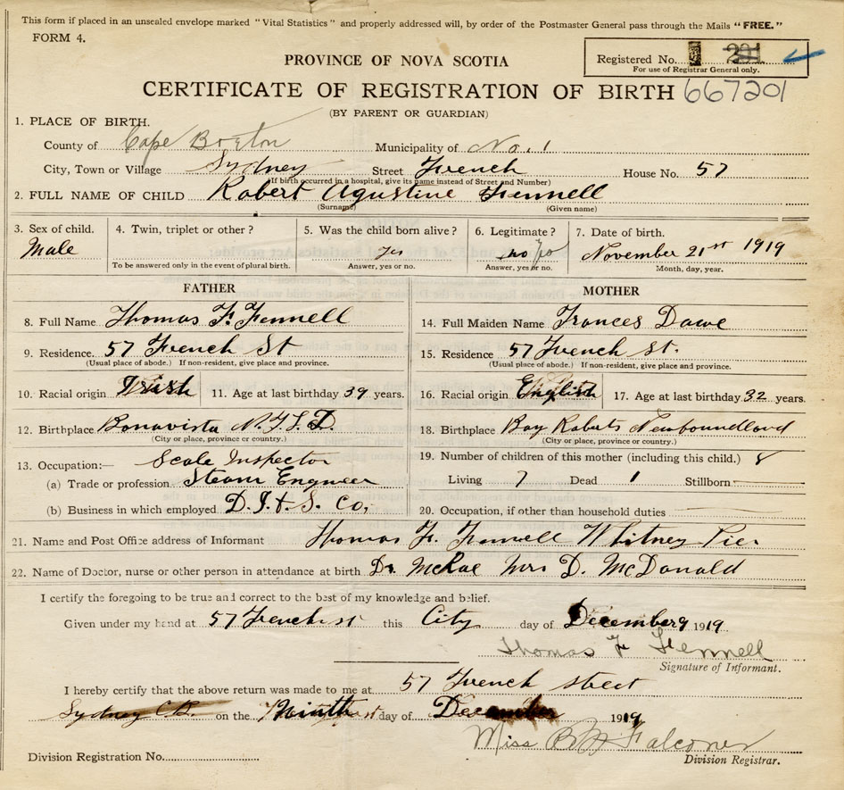 born at Sydney Cape Breton County on November 21, 1919