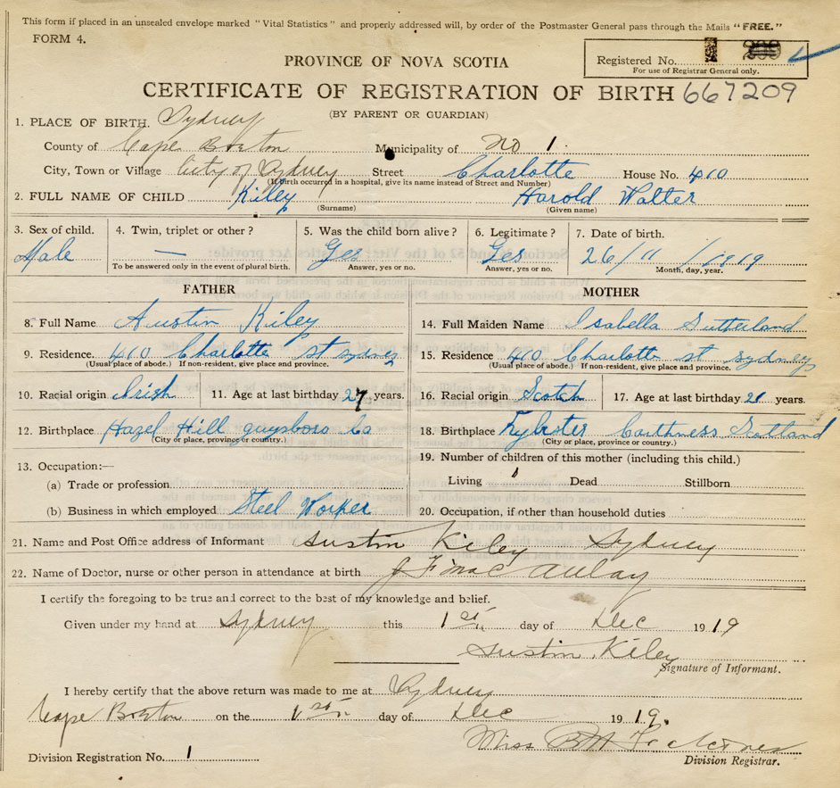 Name of Father Austin Kiley MAIDEN NAME of Mother Isabella Sutherland