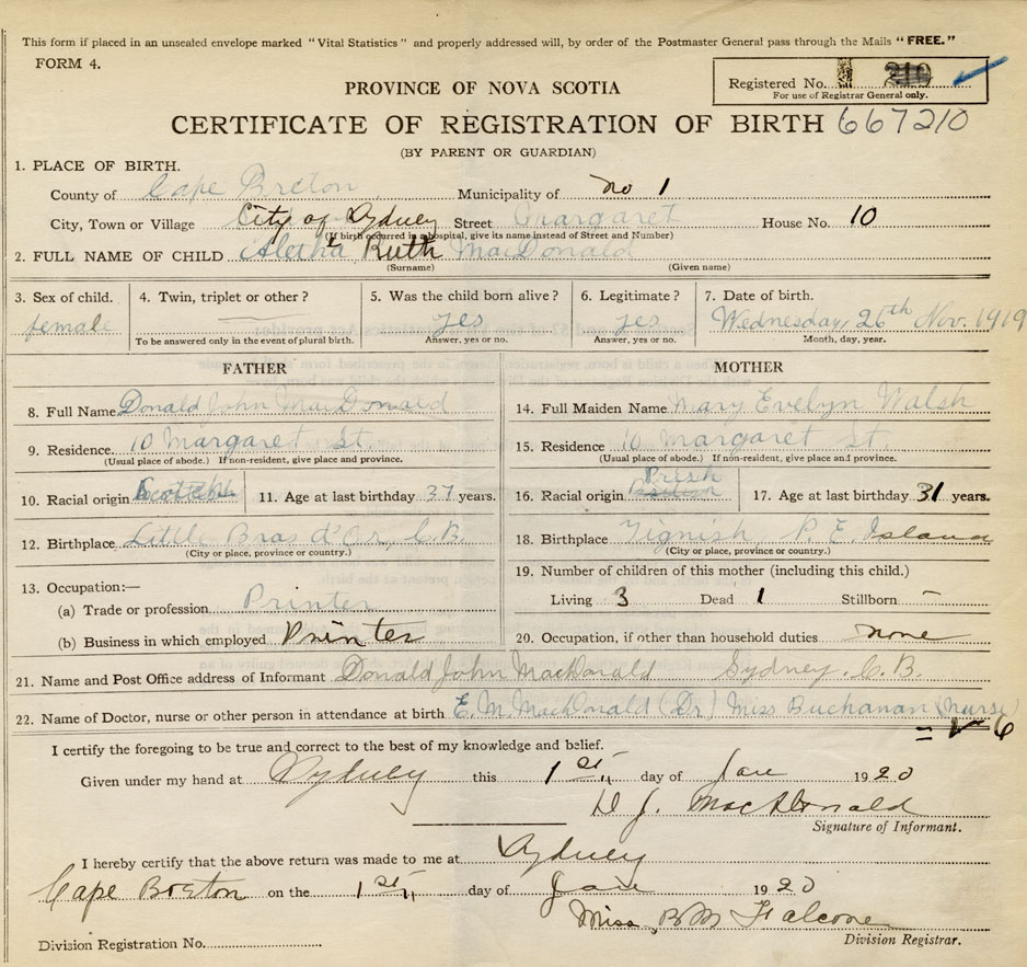 born at Sydney Cape Breton County on November 26, 1919