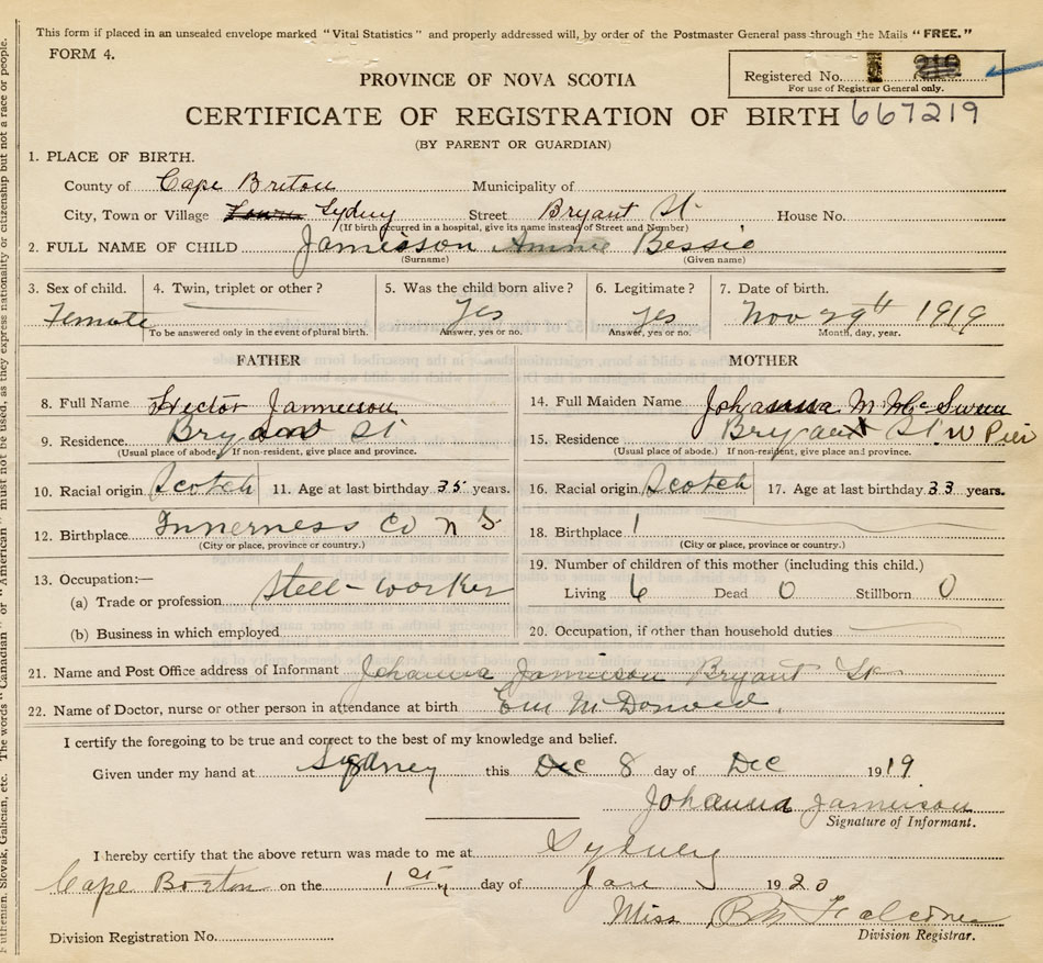 Date of Birth November 29, 1919 Place of Birth SydneyCounty of Cape Breton