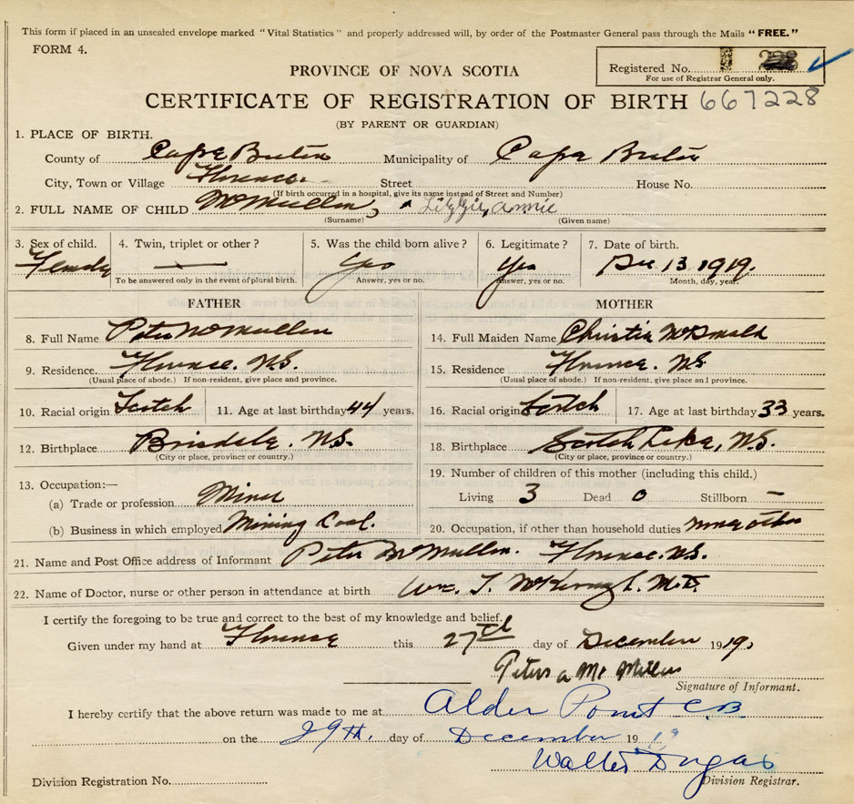 Date of Birth December 13, 1919 Place of Birth FlorenceCounty of Cape Breton